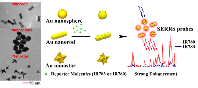 表面增强共振拉曼光谱 (SERRS) 由于具备高灵敏度,高信号稳定性,特征指纹峰明显等优势,在肿瘤早期诊断及引导手术切除等方面展现巨大潜力。h漫 李聪课题组张云飞同学经研究发现当使用七甲川花箐衍生物(IR780和IR783)作为SERRS报告分子时,报告分子化学结构的微小改变可引起SERRS信号的显著增强(IR780较IR783的增幅可达到14倍)。此项研究证明:优化花箐类衍生物化学结构是提高SERRS纳米金探针灵敏度的有效途径。上述工作已发表在Journal of Innovative Optical Health Sciences杂志上。