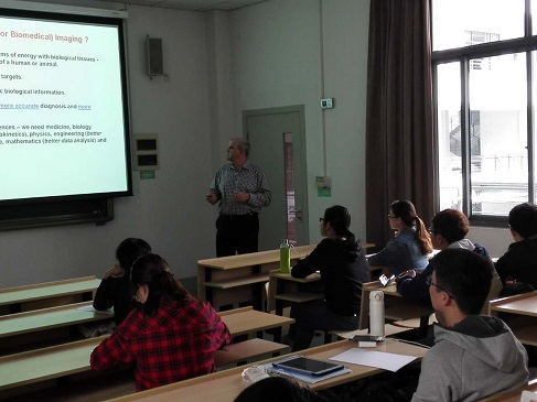 2016年10月25日上午,英国帝国理工学院自然科学学院化学系Nicholas Long教授在h漫 李聪教授的陪同下访问复旦h漫 ,莅临放射药学教研室对研究生课题进行了一对一指导。下午,Long教授向h漫 20余名研究生做了Molecular imaging相关的前沿学术讲座,介绍了Optical Imaging、PET/SPECT、MRI、Ultrasound等成像技术原理及其在疾病早期诊断、药物示踪和疗效评估中的重要临床意义。Long教授会后与同学亲切交流,为同学们答疑解惑。