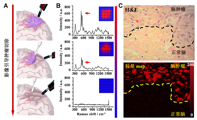 探针引导胶质瘤手术切除。(A)手持式拉曼成像仪引导胶质瘤切除示意图;(B)手术过程中探针拉曼信号;(C)H&E组织染色证实探针准确示踪胶质瘤边界。