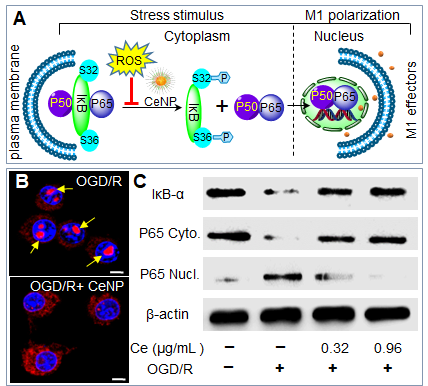 图3. 调控小胶质细胞表型极化机制图。(A) 纳米铈消除ROS抑制促炎性NF-κB信号通路。(B)纳米铈抑制小胶质细胞P65蛋白的胞内转移。(C)纳米铈抑制iκB的磷酸化和P65蛋白核转移。
