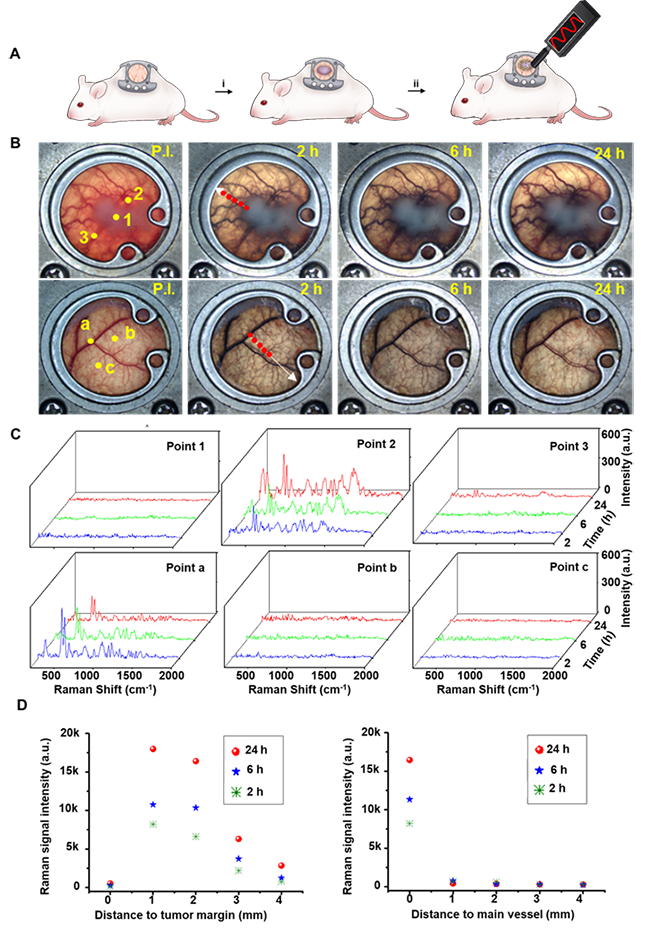 图二:SERRS探针勾勒小鼠脊背皮窗模型中胶质瘤浸润边界
