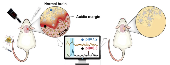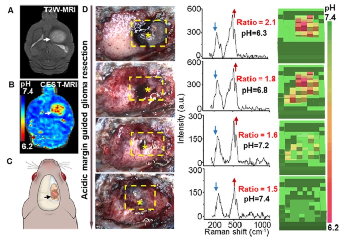 近日,h漫 李聪教授、附属华山医院毛颖教授以及类脑智能科学与技术研究院张孝勇研究员联合研究团队,与意大利都灵大学合作,在脑胶质瘤手术导航策略方面取得重要进展。他们发现了病人胶质瘤浸润组织恶性程度与组织间液酸化程度间正相关性,构建了pH比率响应型表面增强拉曼探针,提出了酸性“代谢边界”导航手术的新策略,提高了胶质瘤模型的切除率及生存时间。4月7日,该成果以《pH比率响应表面增强拉曼探针可视化肿瘤酸性代谢边界导航手术》(pH ratiometrically responsive surface enhanced resonance Raman scattering probe for tumor acidic margin delineation and image-guided surgery)为题发表在《化学科学》(Chemical Science)杂志。