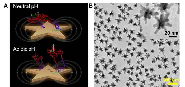 图2. pH响应新机制。(A)基于空间取向分子内能量转移机制(SOIET)的pH比率响应SERRS探针;(B) pH比率响应SERRS探针透射电镜(TEM)图。