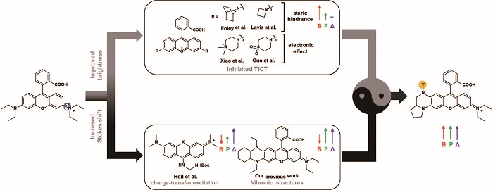 图1. 新型设计策略用于同时提升染料的亮度、光稳定性及Stokes位移。B,P和Δ分别代表亮度,光稳定性和Stokes位移