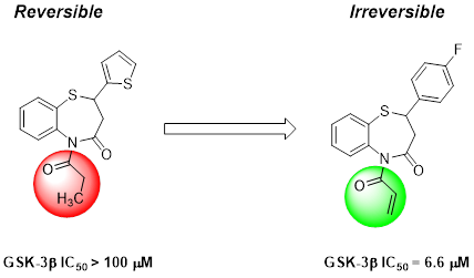 近日,h漫 药物化学系楚勇团队在药物化学领域权威杂志 Journal of Medicinal Chemistry上发表了题为 Discovery of Novel Benzothiazepinones as Irreversible Covalent Glycogen Synthase Kinase 3β Inhibitors for the Treatment of Acute Promyelocytic Leukemia的研究论文(原文链接://doi.org/10.1021/acs.jmedchem.0c02254),首次报道了一类具有苯并硫氮杂?酮结构的不可逆GSK-3β共价抑制剂,能选择性共价结合于GSK-3β特异的Cys14残基,并显示出良好的亚型选择性和激酶选择性。该抑制剂对多种肿瘤细胞表现出较好的抑制增殖作用和诱导白血病细胞凋亡能力,尤其对ATRA耐药细胞也表现出较好抑制活性。在早幼粒细胞白血病小鼠模型上表现出良好的抑制肿瘤增殖作用。此外,该抑制剂也具有良好的安全性和体内药代动力学性质。研究结果表明该类共价抑制剂具有潜在的治疗早幼粒细胞白血病的临床应用价值。