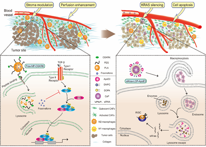 The TME of pancreatic cancer contains various mesenchymal cells and dense extracellular matrix, which together form a solid barrier to prevent drug delivery and penetration into the tumor. The formation of this barrier is associated with the activation of cancer-related fibroblasts (CAFs) by transforming growth factor (TGF-β) signaling in TME. On the other hand, KRAS mutation in pancreatic cancer cells is the marker of the initiation and progression of 90% pancreatic cancer. Due to the undruggable nature of KRAS mutation, chemotherapy drugs used currently in clinic could not interfere with it. Besides, the relatively high systemic toxicity of chemotherapy drugs resulted in poor prognosis hence hindered its application in treatment. Professor Jun Chen’s group from School of Pharmacy of Fudan University and Professor Xiaoling Gao’s team from Shanghai Jiao Tong University collaborated to report a study of the sequentially combination of TME regulation and cancer cell target intervention in the treatment of pancreatic cancer. Firstly, the natural product fraxinellone with TGF-β regulatory effect was screened and encapsulated in targeted nanomaterials. The formed nanoparticles effectively inhibited the activation of CAFs, reduced the secretion of collagen, promoted the normalization of tumor blood vessels and facilitated the infiltration of the subsequent nanoparticles in tumor sites. Secondly, the biomimetic high-density lipoprotein nanoparticles were designed and constructed in order to silence KRAS mutation. The nanoparticles were absorbed by pancreatic cancer cells in large quantities and then successfully escaped from lysosomes into the cytoplasm to play the role of gene silencing. In the in situ model of pancreatic cancer, sequential administration of the two agents achieved high efficacy and low toxicity in anti-cancer treatment, and significantly prolonged the survival period of tumor-bearing nude mice. This study provides a promising method for the treatment of tumors with rich stroma.