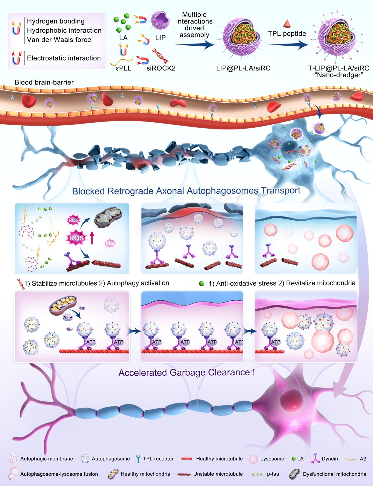 Nano-dredger is designed to co-deliver siROCK2 and lithospermic acid B (LA), a polyphenol compound, to counteract multiple pathologies causing autophagosome axonal transport disorders. By effectively reversing oxidative stress, ATP depletion, autophagy blockage, and microtubule disruption, this strategy successfully clears obstructed axonal autophagy, enhancing autophagic flux. Consequently, it reduces pathological protein accumulation and improves cognitive function in 3×Tg-AD transgenic mice models, demonstrating the potential of axonal autophagy regulation as a promising new therapy for AD.