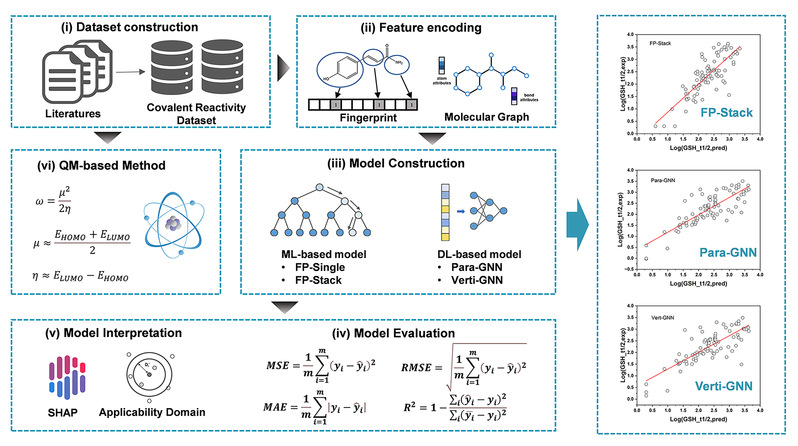 研究团队首先从Web of Science数据库中筛选出与共价化合物反应性相关的文献,通过脚本自动化过滤和人工阅读,精心构建了一个涵盖419个半胱氨酸靶向共价化合物的高质量数据集。以此为基础,团队选用七种分子指纹和七种机器学习算法组合,建立多个单一机器学习模型。随后采用集成学习算法,将表现最优的单一机器学习模型作为基模型,线性回归模型作为元模型,构建了FP-Stack模型。此外,研究团队还开发了四种深度学习模型,包括图卷积网络(GCN)、图同构网络(GIN)、图注意力网络(GAT)和GT(使用Pytorch Geometric中的TransformerConv层),并探索了垂直架构和并行架构两种不同的架构设计。经对比验证,FP-Stack模型在预测性能上表现最佳,且具有良好的域外延展性。