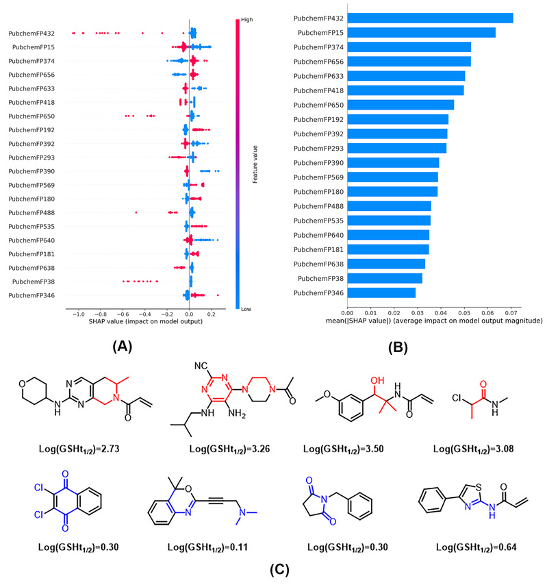 模型SHAP分析结果展示。数据集中所有样本排名前20的SHAP值分布(A)和平均值(B),以及具有代表性子结构特征的化合物(C)。红色和蓝色特征分别表示对化合物反应性的削弱和增强。