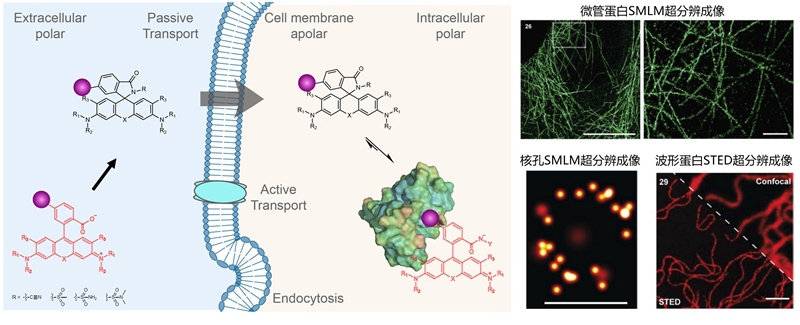 近日, 王璐青年研究员和Kai Johnsson教授通过引入不同取代的苯磺酰胺以及烷基酰胺,能够更精准、更大范围地调节开闭环结构的平衡。在不改变染料光学性质的基础上,通过调节开闭环结构的比例,进而调节细胞内目标蛋白和背景荧光信号的相对比值,实现免洗条件下活细胞内高信噪比成像。而通过引入给电子能力更强的烷基酰胺的结构,可使罗丹明类染料产生自闪烁荧光信号,因而可用于微管蛋白和核孔结构的单分子定位超分辨成像(SMLM)。