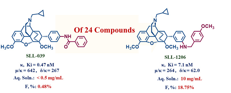临床上对顽固性疼痛治疗药物存在明确的未满足需求。吗啡、哌替啶等阿片类药物镇痛效果可靠,但因在呼吸抑制、成瘾等严重不良反应,用药受到限制。阿片kappa受体是具有前景的非成瘾性镇痛药物研究靶点之一,早前发现的芳香乙酰乙二胺类kappa受体激动剂的强镇痛效果已在临床试验得到验证,但因焦虑、镇静及幻觉等中枢副作用问题,无法成为安全有效的临床镇痛药物。为寻找中枢安全性更好的新型kappa受体激动剂,研究团队以前期研究发现的高选择性kappa受体激动剂020ACP(Li, et al, ACS Chem Neurosci, 2017)、SLL-039(Xiao, et al, J Med Chem, 2019)及相关化合物构效关系研究(Sun et al, Bioorg Med Chem, 2018; Liu, et al. ACS Chem Neurosci, 2021)为基础,选择安全性、焦虑副作用表现有优势的环氧吗啡喃类结构为母核,与此前研究确立的低镇静性7α-氨苯去甲蒂巴因骨架相结合,引入适当的空间位阻降低对mu和delta阿片受体活性以便提高对kappa受体作用的专一性,利用支链的刚柔变换改善水溶解性及生物利用度,经两轮分子设计、合成、生物活性筛选及评价,发现新型高选择性kappa受体激动剂SLL-1206。