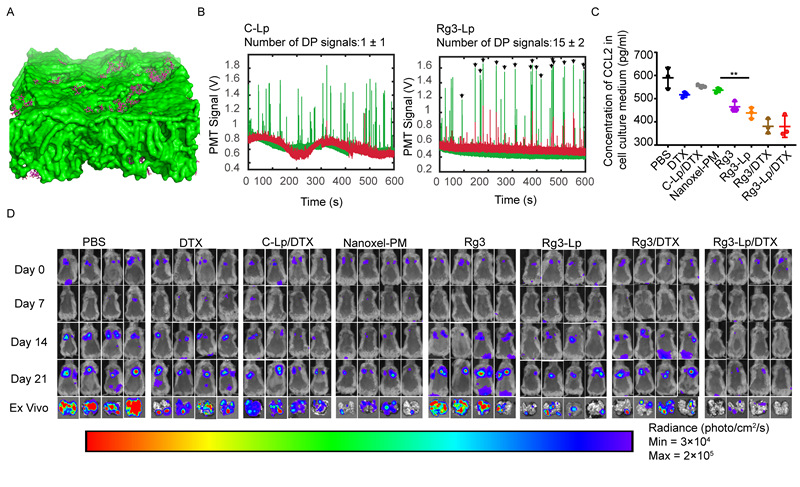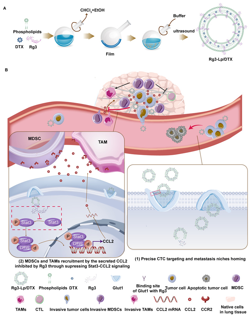 人参皂苷Rg3是一种来源于人参的天然活性成分,该团队发现其具有药物、膜材、靶头等多重作用。作为药物,Rg3不仅自身具有良好的抗肿瘤活性,还可显著提高共载的化疗药物对CTC的杀伤效果;作为辅料,不仅可替代胆固醇改善脂质体膜稳定性和流动性,Rg3的葡萄糖基团可伸出脂质体表面,特异性识别并结合CTC表面过表达的葡萄糖转运体1(glucose transporter1, Glut1),实现对体内循环系统转移的“种子”CTC的捕获与杀伤。肿瘤细胞分泌的单核细胞趋化蛋白(C–C chemokine ligand 2, CCL2)是构成转移微环境的重要因素,它会帮助CTC逃过机体免疫监视。该研究证明,当人参皂苷脂质体随着CTC细胞到达转移病灶后,人参皂苷Rg3可通过抑制CTC的CCL2分泌,从而破坏转移微环境的形成,帮助免疫系统杀伤和识别CTC。