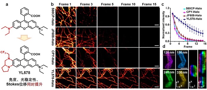 前期研究中,h漫 王璐青年研究员通过优化罗丹明染料得到了一系列可用于活细胞蛋白超分辨成像荧光探针(Nat. Chem. 2020; JACS 2021)。在本项目中,王璐课题组联手湖南大学袁林课题组提出了一种同时提升染料多个性能的新策略(图a),将抑制TICT作用策略和不对称染料体系策略相结合,可同时改进染料亮度、光稳定性以及Stokes位移。在固定细胞中的波形蛋白STED成像中,在同样的损耗激光条件下(775 nm),商业化STED探针580CP-Halo、CPY-Halo和JF608-Halo在2-3帧成像后,其亮度会衰减至最初亮度的50%以下,而YL578-Halo在9帧程之后仍具有50%以上亮度,且可维持波形蛋白57±5 nm成像分辨率(图b-1c)。由于YL578染料优越的光稳定性,作者将其用于了线粒体输入受体Tomm20蛋白的3D-STED超分辨成像(图d)。