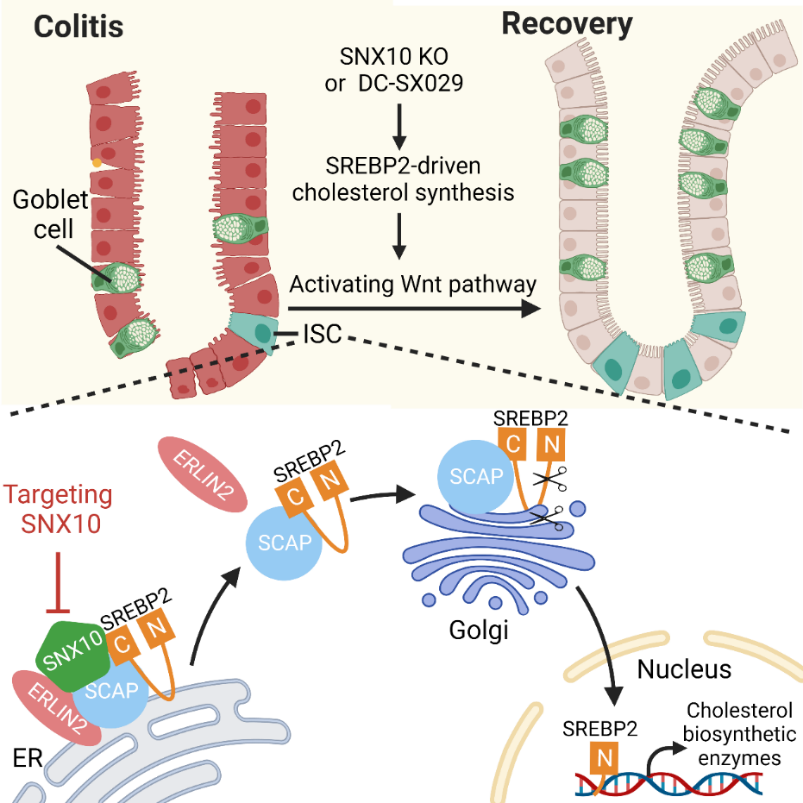 机制图:SNX10 通过将胆固醇调节元件结合蛋白2(SREBP2)锚定在内质网上,阻止其向高尔基的转运和活化,从而抑制细胞内胆固醇的合成,导致IBD中ISC增殖与分化异常。靶向SNX10的小分子抑制剂DC-SX029能够有效促进IBD模型小鼠的黏膜修复。