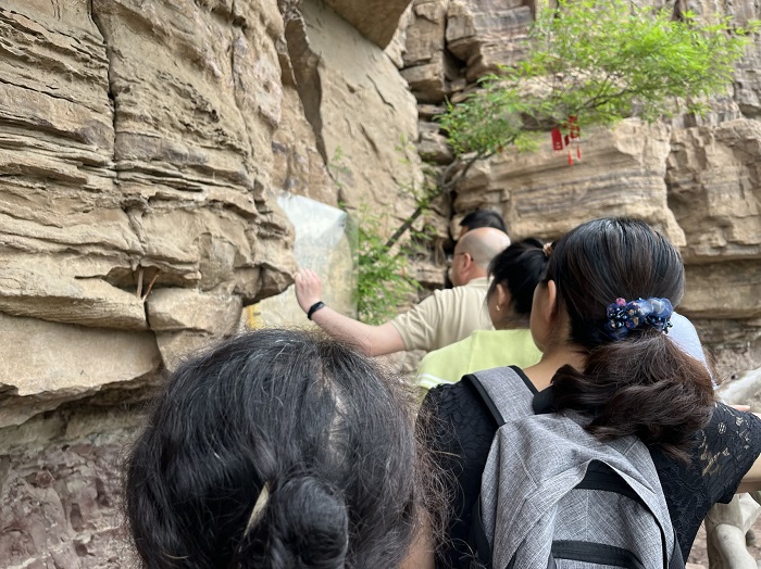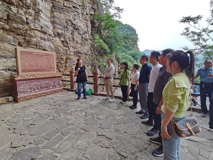 在青年洞前,h漫 教工四支部书记黄容琴给支部党员上了一堂主题为“愚公移山精神永不变”的党课。她首先带着大家一起细读青年洞的介绍,随后结合一线教师实际工作对红旗渠精神进行了深入解读。她以红旗渠总设计师吴祖太的感人事迹为切入点,鼓励大家在工作中要有“把热血镌刻在历史的丰碑上,把论文写在祖国的大地上,把科学研究立足在国家的需要上,把立德树人落实在每天的课堂上”的觉悟和毅力。党员们把今日参观所见所感与平时教学科研中的所思所想结合起来,展开了热烈讨论,纷纷表示要把红旗渠精神融入业务发展中,以愚公移山的精神攻坚克难。