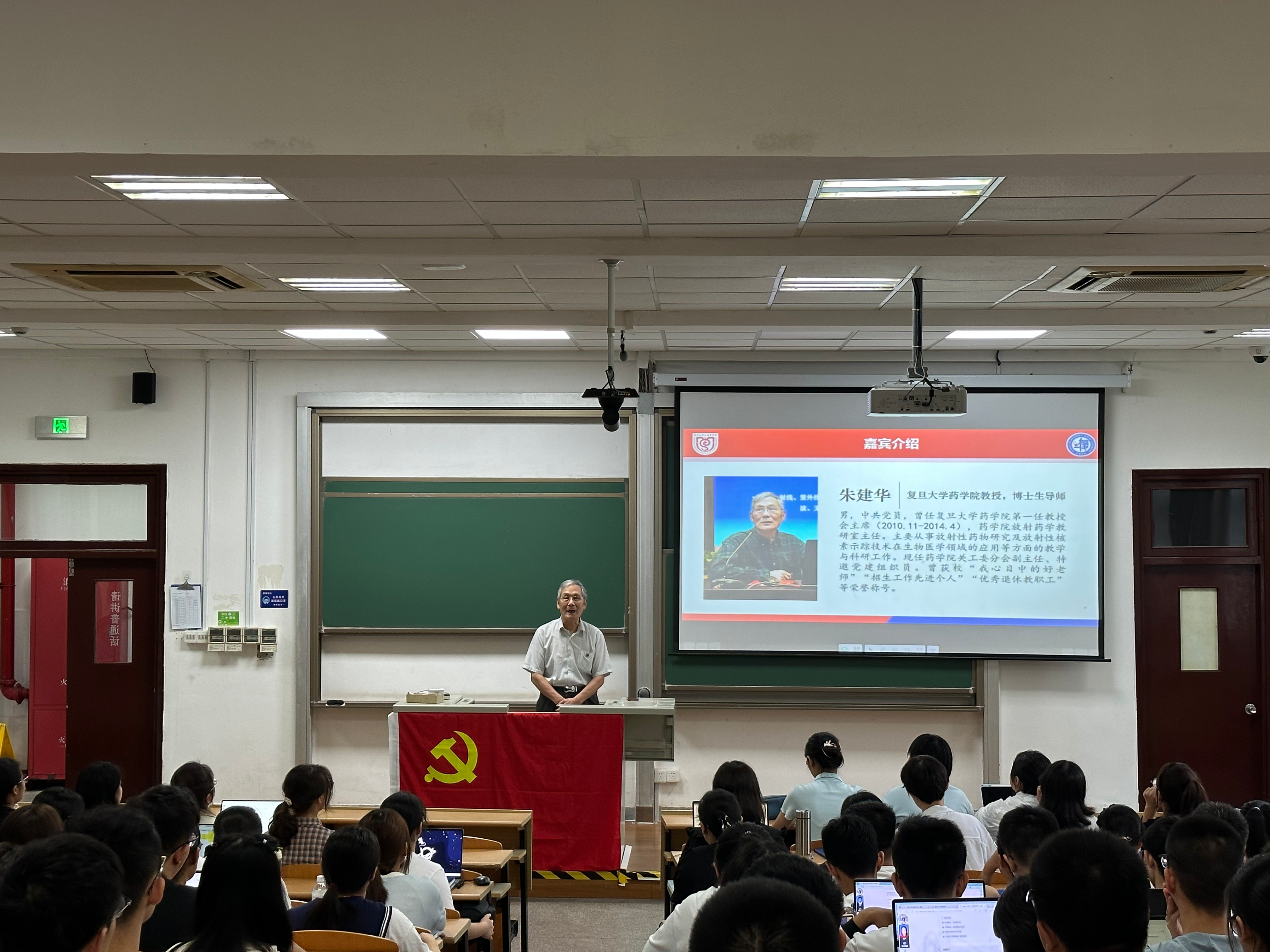 朱教授是一名党龄50多年的老共产党员,在班会课上,他讲述了身边三位优秀党员的先进事迹。核药学领域的一位老教授不惧放射研究的危险,带领同事在专业领域上不断取得突破,教研室被评为上海市模范集体;曾担任h漫 院长、中国药剂学领军人物奚念朱教授,拒绝高薪工作,将一生全部奉献给了h漫 的教育和科研事业;方晓玲教授在名利冲突前,不计较个人得失,她身上的奉献精神令人敬佩。朱建华教授说,其实这些看起来都是平凡的事迹,但更能显现出共产党员舍己忘我、甘于奉献的优秀品质。