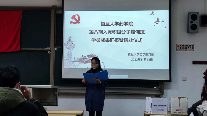 2022年11月14日中午,h漫 第八期入党积极分子培训班成果汇报暨结业仪式于张江校区Z2201教室举行。h漫 党委副书记史雪茹,h漫 学生办公室副主任、学生党总支副书记徐琛和全体培训班学员出席了此次闭幕式。本次闭幕式由h漫 2021级生物药物学系硕士研究生艾欣主持。