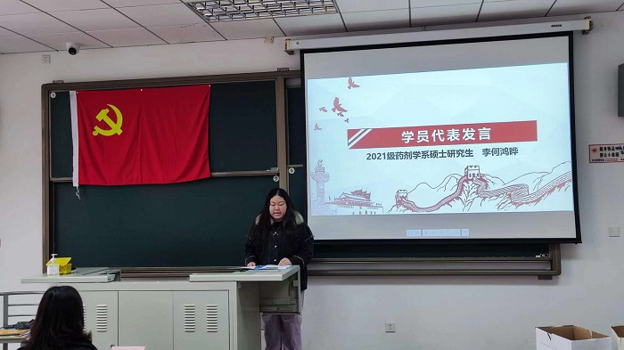 之后,h漫 2021级药剂学系硕士研究生李何鸿晔作为学员代表发言。她总结并分享了自己在党校中的学习成果,并结合入党动机,向大家表达了成为一名先进党员的热切渴望,并呼吁大家一起不忘初心,砥砺深耕,为共产主义事业奋斗终身。