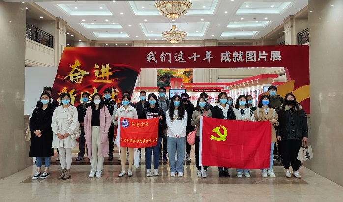 随后,各小组前往光华楼2楼参观展览。展会以时间为轴,向同学们展示了h漫 近十年的光荣历程,“我们这十年成就图片展”与二十大报告的主题相契合:高举中国特色社会主义伟大旗帜,全面贯彻习近平新时代中国特色社会主义思想,弘扬伟大建党精神,自信自强,守正创新,踔厉奋发,勇毅前行,为全面建设社会主义现代化国家、全面推进中华民族伟大复兴而团结奋斗!