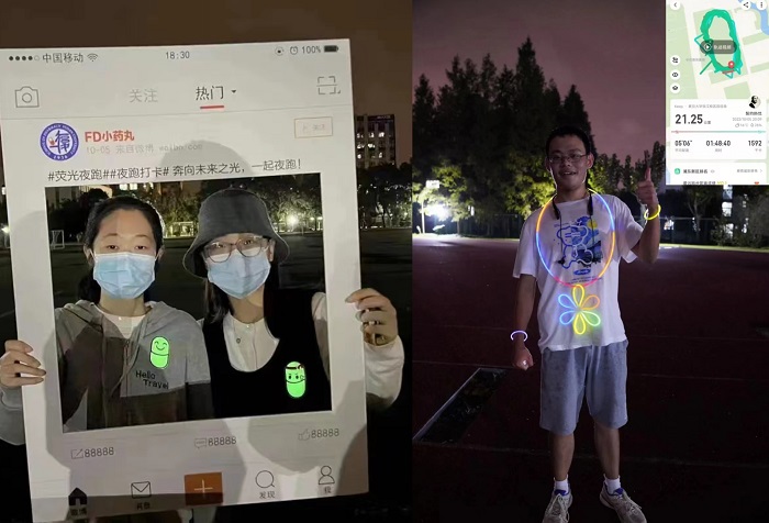 10月5日,骤降的气温阻挡不了h漫 跑步爱好者们的热情。晚上七点,约三十位同学在张江操场共同参加了“奔向未来之光”荧光夜跑活动。参与者们佩戴荧光手环,身贴荧光贴纸,成为在黑暗中不断聚集、流转的荧光。他们把轻盈的脚步与多彩的荧光结合,闪耀了张江的天空,点亮了夜色,也一同奔向未来。跑步活动持续两个多小时,大家在跑步中收获了乐趣与健康,更有同学坚持跑完全程,完成了一个半马、21公里的目标。凉爽的月夜下,轻松的假期中,大家共同享受了对突破极限的渴望以及生生不息的追求。