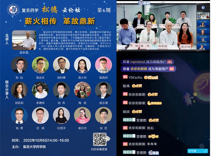 10月6日下午,h漫 邀请原药剂教研室主任、国家重大科学研究计划首席科学家蒋新国教授及其弟子和课题组成员线上线下共同分享,举办松德云论坛第6期特别活动。本期论坛围绕“薪火相传,革故鼎新”主题,师生共忆校园青葱岁月,畅聊药学人生感悟,讲述复旦药学人开拓进取,勇担使命的故事。蒋老师从怀念恩师奚念朱教授治学为人经历着手,介绍了h漫 药剂学科的发展历史,也展现了一代代药学人秉持创新的观念投身科研强国,振兴医药的历程。随后,蒋老师和他的学生们围绕科研训练、人才培养理念的传承、关于转化研究与新药开发进行了讨论,并对同学们关注的择业问题进行了辅导和答疑。论坛在主持人h漫 常务副院长潘俊老师引用奚念朱教授的寄语中落下帷幕,三百六十多名观众相聚云端共同参与本次活动。