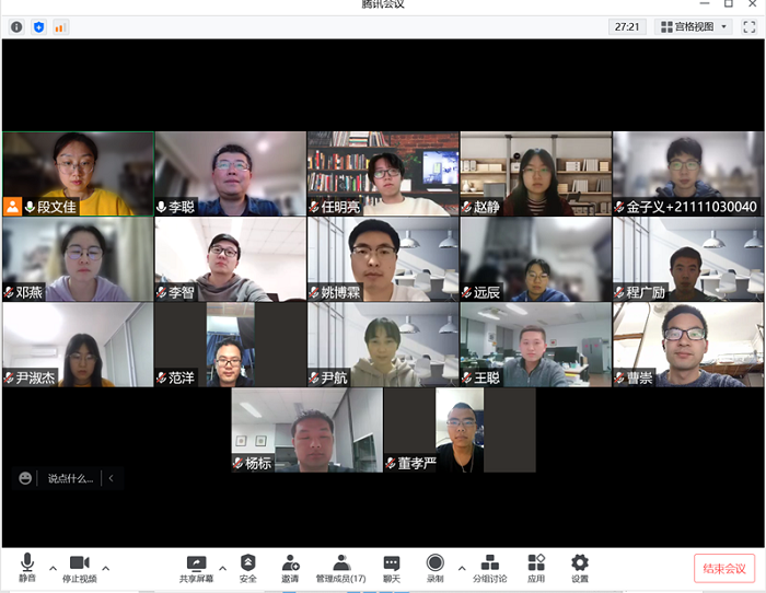 李聪教授课题组全体成员坚持“校园准封闭,学习不断线”的理念,通过线上会议方式开展模拟答辩、进度汇报、文献学习等活动,保障在线不减质,居家不降效,抢抓科研进度,提高学术水平。准封闭期间每晚八点,是位于气泡内外15名成员约定好的腾讯会议“上线时间”,每日轮流由两位同学主讲当日的学习内容,讲述完毕后会由老师给予点评并就下一步工作提出建议。截至目前,已开办空中课堂20次,包含模拟答辩5场,研讨课题13项,文献学习2次。学习结束,便是导师和学生间交流时间,气泡内的同学讲述校内见闻,反映生活学习问题;气泡外的导师则分享学校防疫政策以及抢菜策略,热烈讨论为大家驱散了封闭期间的阴霾,带来了丝丝关爱和温暖。大家约定,配合防疫,共同努力,期待在四月天的校园内见面!