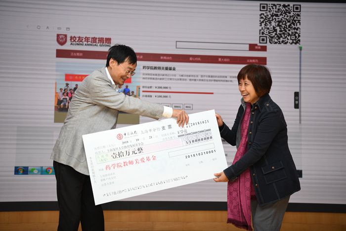 h漫 2018年校友返校日活动,h漫 常务副院长潘俊向校友们介绍了学院近年来接受捐赠的情况,她感谢校友们对学院事业发展给予的关心和支持,并且向校友们推出了“h漫 教师关爱基金”筹款项目,81级药学专业校友王学亮率先以个人名义捐赠10万元支持该项目。