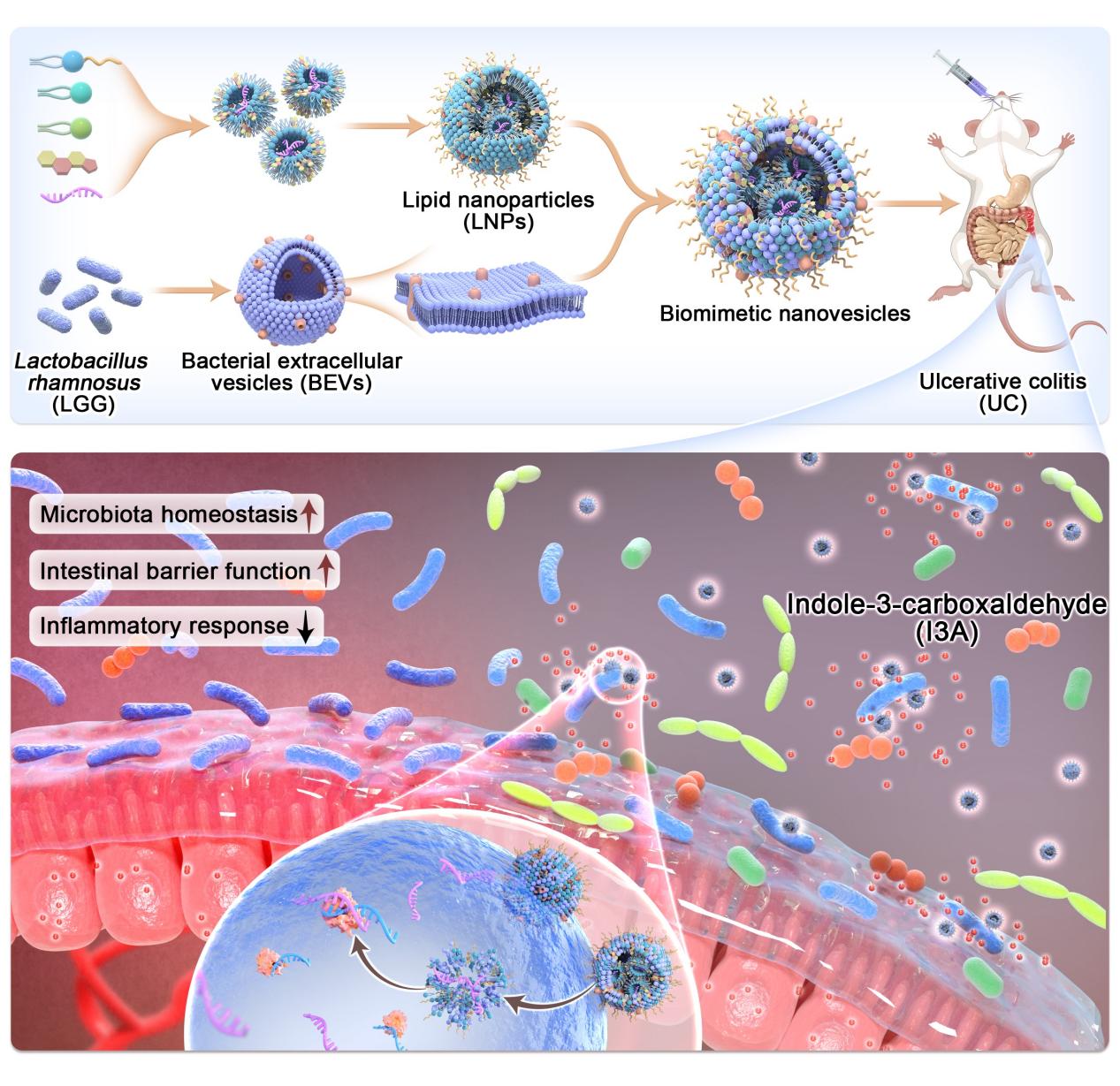 近日,h漫 戚建平课题组在Science Advances期刊发表最新研究成果“miRNA-loaded biomimetic nanoparticles orchestrate gut microbe to ameliorate inflammatory bowel disease”,报道了一种能够对共生菌鼠李糖乳杆菌进行改造的仿生纳米颗粒。通过将鼠李糖乳杆菌来源的细菌胞外囊泡(Bacterial extracellular vesicles, BEV)与脂质纳米粒(Lipid nanoparticles, LNP)进行功能化结合,制备了细菌胞外囊泡-脂质纳米粒(BEV-LNPs)。该纳米载体对鼠李糖乳杆菌的靶向效率显著高于大肠杆菌。体内外稳定性实验表明,相较于传统脂质纳米粒,BEV-LNPs在模拟生理介质及胃肠道环境中展现出更佳的稳定性。将该纳米载体与5-ASA联合使用时,促进了鼠李糖乳杆菌的增殖并增加了吲哚-3-甲醛的生成量,在急性和慢性结肠炎模型中均显著改善了治疗效果,有效减轻肠道炎症,修复受损肠道上皮屏障,并促进肠道菌群重新恢复平衡。